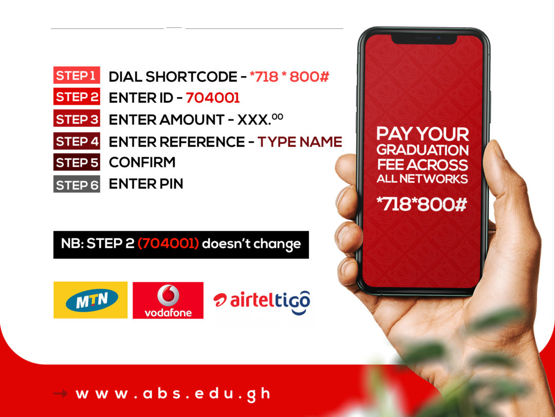 Register for graduation Full Name *Programme *KNUST MBAWrexham MBAMSc Accounting & FinanceMSc. Communication & International Marketing MSc. Public AffairsMSc. International RelationsMSc. Human Resource ManagementLevel 7 Extended Diploma in Strategic ManagementBSc. Business Administration & Global LeadershipLevel 6 Extended Diploma in Management QualificationLevel 6 Extended Dilpoma in Theology and ManagementLevel 7 Extended Computing TechnologiesStudent ID *Email * Graduation Fee : GHC 1500.00 Kindly proceed to make payment using the below details.Thank you. *Please use your Index Number as reference. MAKE PAYMENT (MoMo) Alternatively, you can do a bank transaction using the below details. Account Name: ACCRA BUSINESS SCHOOL LTD - EVENTSBank: ABSA BankAccount Number: 021-1060794Branch: Spintex Road Upload payment proof/advise *Kindly upload your payment voucher or payment snapshot here.Submit Registration